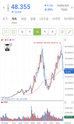 현재 SOXL의 가격은 $10.5499, TQQQ의 가격은 $48.355 입니다. 차트 전체로 봤을 때 반등은 하였지만, 장기적으로 지금은 명확한 저점입니다.