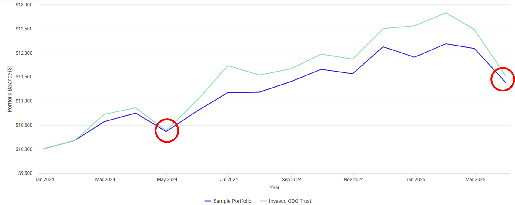 먼저, JEPQ 50% + QQQ 50% 입니다. 24년도에 JEPQ의 성적이 24.9%로 높아서 그런지, QQQ 단일 종목으로 가는 경우와 크게 다르지 않아보입니다. 그래서 그런지, JEPI가 좋은 방어력을 보여줬던 빨간색 동그라미 영역에서 QQQ 단일종목과 크게 차이나지 않는 하락률을 보이는 것으로 확인됩니다.